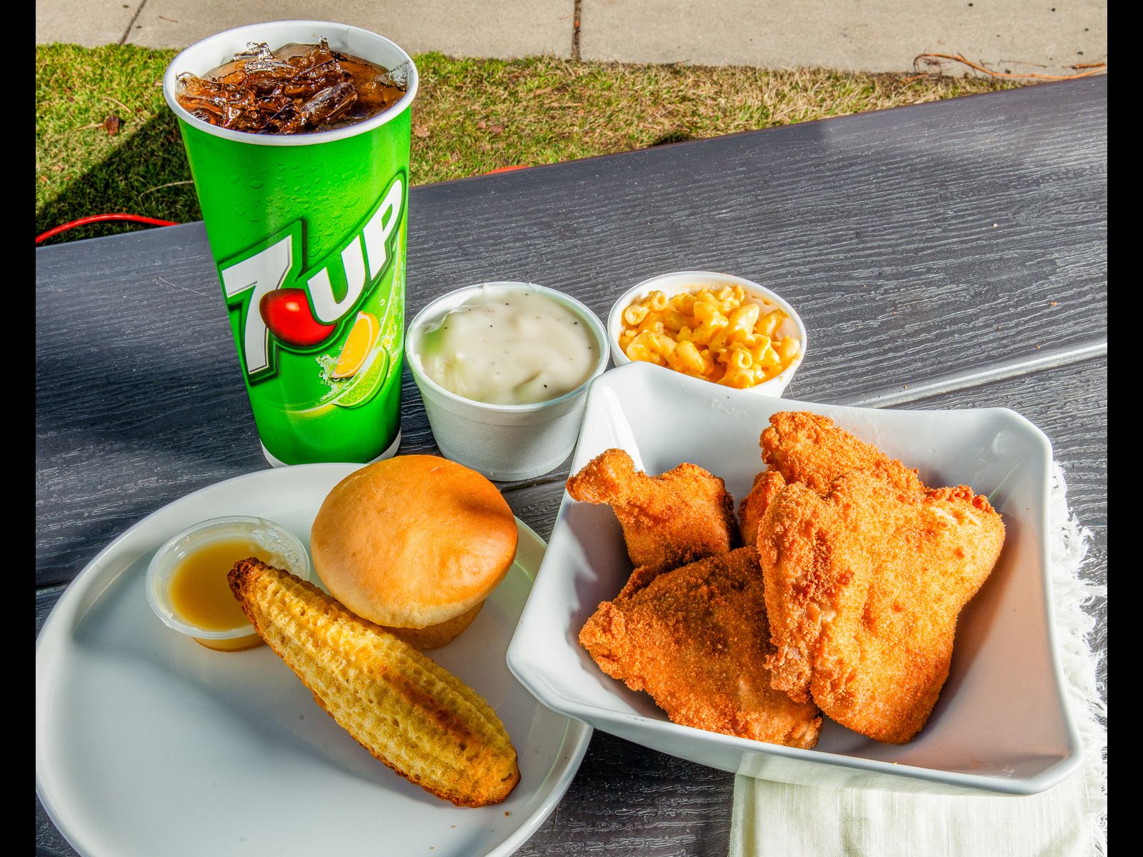 Includes a breast, leg, wing, and thigh, a side dish of your choice, a roll and cornpone, and a medium drink.